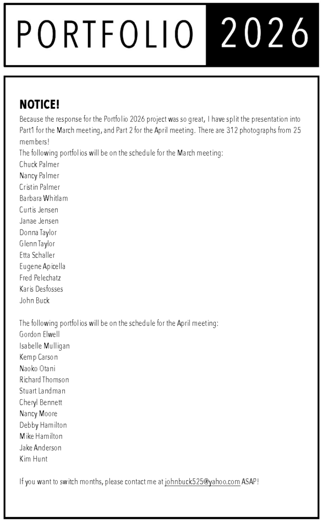 The concept of PORTFOLIO2026 is to add something different to your photographic experience by choosing a subject and creating a portfolio of images that demonstrate your personal vision. This project was initiated as an alternative to our monthly competitions.